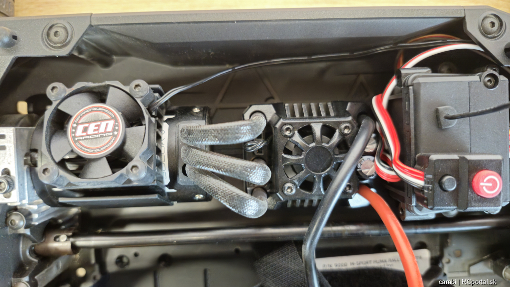 3658 striedavý motor s 3000KV, Hobbywing MAX10 SCT ESC s 100A (bezvýznamný s T-plug) ktorý je vodotesný a prachotesný, obsahuje vstavaný kondenzačný modul, automatická kalibrácia rozsahu škrtiacej klapky